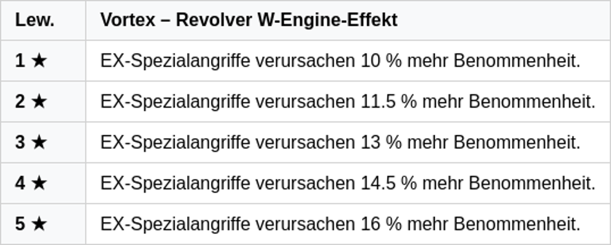 Ob gegen einzelne Feinde oder ganze Gruppen – der Vortex Revolver zeigt sich als vielseitiges Werkzeug im Kampf.Spezialangriffe der EX-Kategorie erhöhen die Benommenheitsschaden um 10 %.