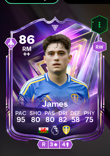 Daniel James's FC Pro card is an 86-rated Right Midfielder, boasting exceptional attributes that define his explosive playing style. His blistering 95 pace is complemented by solid shooting (80), passing (80), and dribbling (82) ratings, alongside 75 physicality, making him a formidable presence on the flank. As a winger, this card excels as a sharp attacking weapon, utilizing his electrifying speed to quickly tear apart the opposing team's defense. He can surge past defenders, create decisive chances, and seize opportunities to score crucial goals, making him an ideal player to help seal the deal in any match.